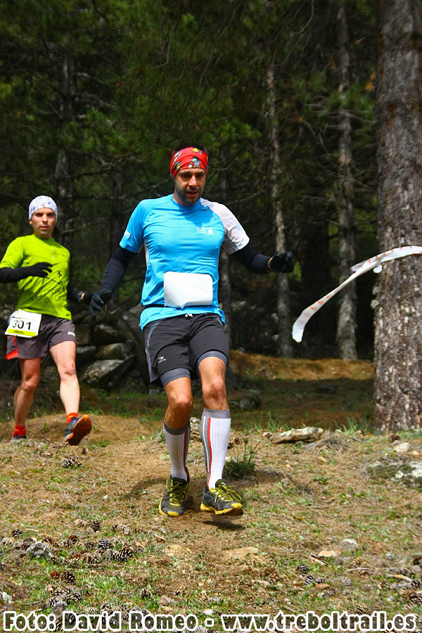 Esta vez si aproveché para comer un trozo de naranja y beber algo de isotónico, pero sin mucha dilación volví a zumbarle, ahora cuesta abajo, me costó algo más esta vez, me adelantó la primera chica y poco después la segunda, que en ese momento era María Luisa… (momento de alucine al ver que hasta entonces iba por delante de ella)… Me gustó mucho fijarme en como bajaba, flotando por encima de las hojas de los pinos, pisando la hierba sin apenas dejar huella, sin darme cuenta debí forzar un poco porque llegados al valle la distancia que me sacaban era pequeña. La verdad es que una de las cosas más bonitas de mi carrera fue ver en primera persona la lucha entre estas dos jabatas.
